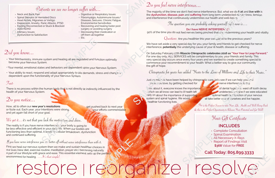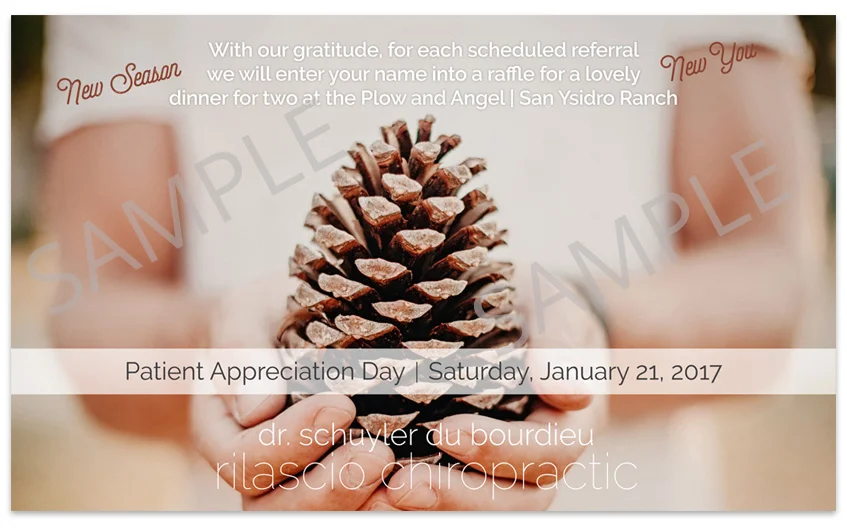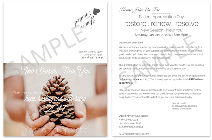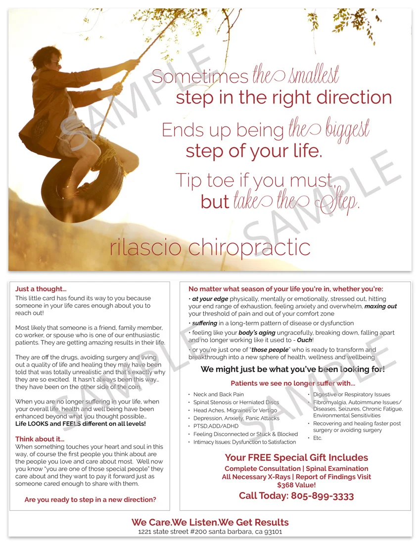 We have consciously created an evolving line of promotional materials that will captivate your audience | promote intrigue and response | invoke an emotional heartfelt connection | and ultimately bridge the gap between an introduction to your office and taking the first step to being in your office. Our intention is for them to see beyond the glimmer of hope that your exceptional chiropractic care could help them but, for them to feel and know through your communication that they are in the right place and in the right hands, bringing them towards optimizing their health, healing and well-being.