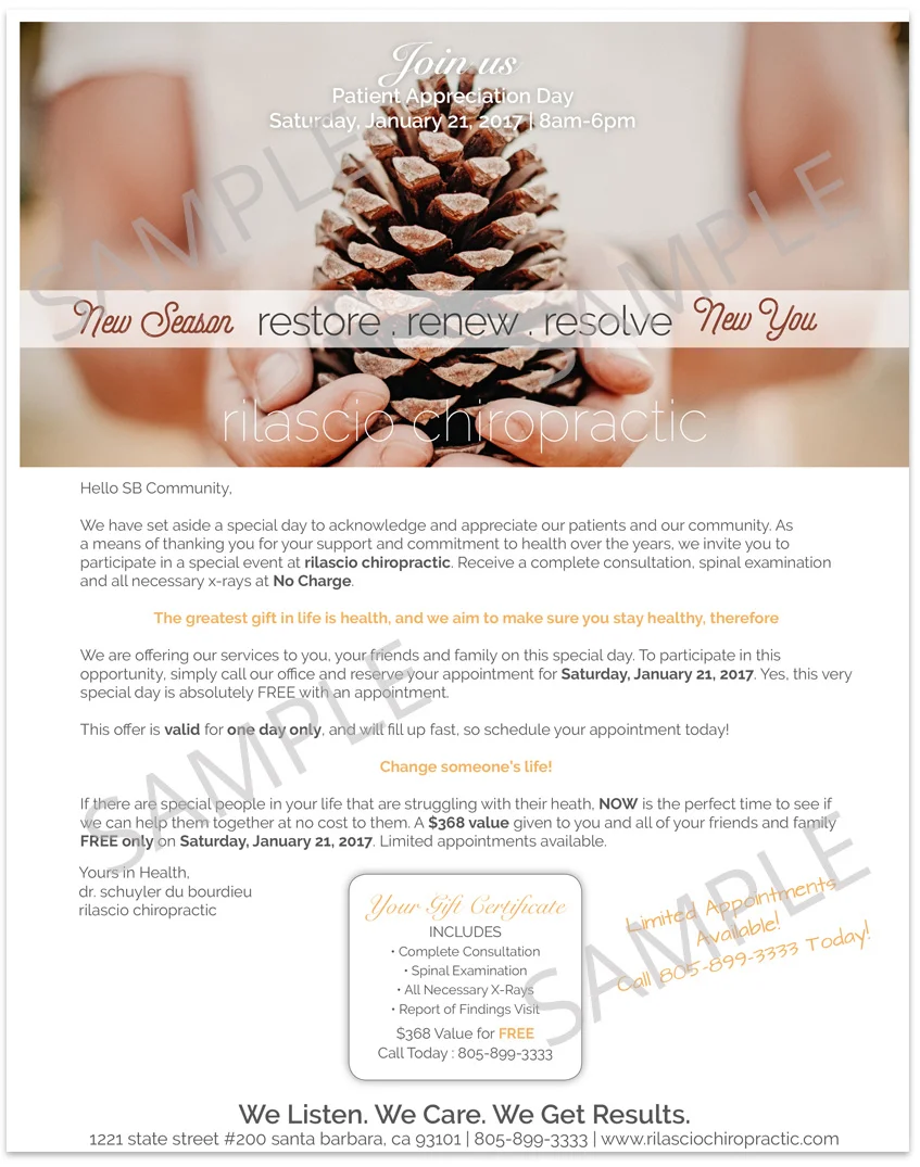 Offering a |Patient Appreciation Day| multiple times throughout the year in your town... lets just say, its a Win|Win|Win for everyone. These focused events "Shout Out" to your community how much you truly care about them receiving the benefits of chiropractic & living out an optimal life with a healthy functioning Nervous System.
